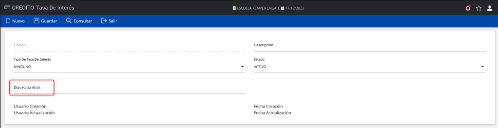 Se agregó un campo llamado Días hacia atrás en la siguiente ruta: Crédito>> Catálogo>> Cálculo>> Tasa de interés, para que al momento de registrar una tasa de interés nueva o modificar una existente, se pueda configurar los días que se restarán de la fecha de trabajo.