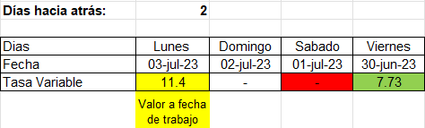 - En el siguiente caso se supone una configuración de 2 días menos, y con una fecha de trabajo de lunes 3 de Julio del 2023, como la configuración indica que se deberán restar 2 días de la fecha de trabajo, el resultado arroja la fecha del 1o. de Julio del 2023, pero como ese día no se tiene ninguna tasa publicada, se tomaría la tasa anterior a esta, que sería de 7.73, correspondiente a la fecha 30 Junio 2023.