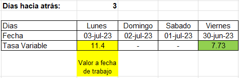 - En el siguiente caso se supone una configuración de 3 días menos, y con una fecha de trabajo de lunes 3 de Julio del 2023, como la configuración indica que se deberán restar 3 días de la fecha de trabajo, como se comentó, no se debe de tomar en cuenta si se tratan de días hábiles o días con tasas publicadas, solo se realizará la resta de los días naturales, por lo tanto, el resultado arroja la fecha del 26 de febrero, que sería de 7.73, correspondiente a la fecha 30 Junio 2023.