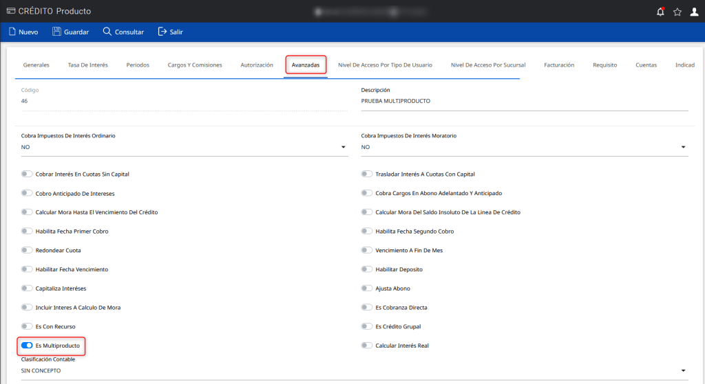 En la pestaña de Avanzadas se selecciona el check Es Multiproducto.