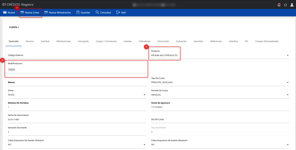 Después de haber habilitado el check Multiproducto en el producto creado, nos dirigimos al registro de crédito y le damos click en Nueva Línea (1), en el apartado Producto (2), seleccionamos el Producto que registramos en los pasos anteriores y automáticamente se habilitará una opción que se llama Multiproductos (3) en donde aparecerán todos los productos que se encuentran activos en el sitio correspondiente.