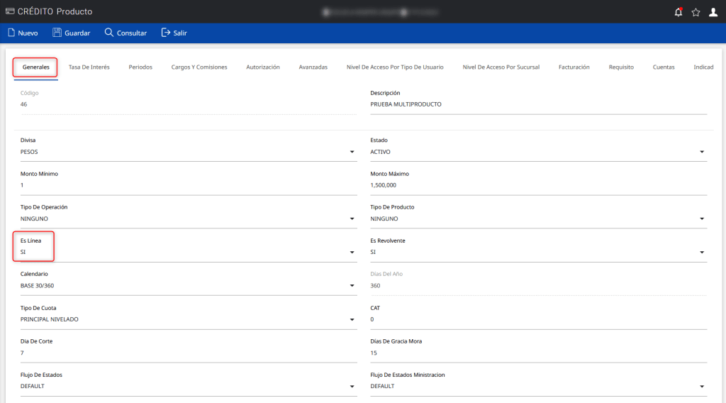 Para llevar el control de que una línea de crédito sea Multi Producto, se llevará a cabo a nivel producto. Por lo que se deberá registrar el mismo en la ruta: