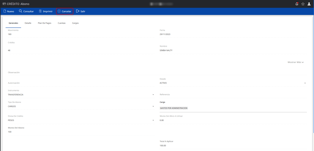 Importante: El abono no se podrá cancelar si cuenta con alguna de estas operaciones activas con fecha posterior al abono que se intenta cancelar: