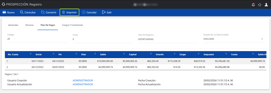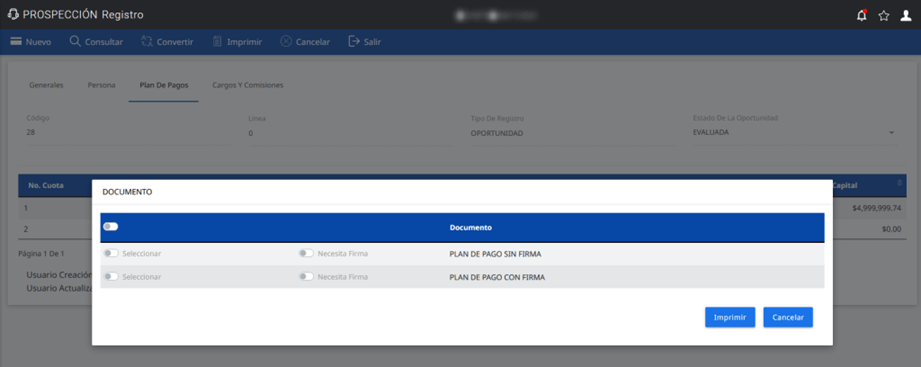 ¡Imprime los formatos plan de pago con y/o sin firma desde el módulo de prospección!